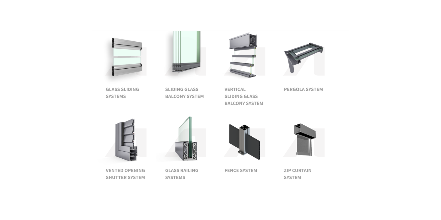 Glass Sliding, Sliding Glass Balcony, Vertical Sliding Glass Balcony, Pergola, Vented Opening Shutter, Fence, Zip Curtain Systems
